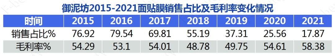 这也让一部分国产专业面膜品牌在面贴膜类目的毛利率持续处于低位。以御泥坊为例,其最近8年来面贴膜的平均毛利率只有53%。在竞争最为激烈的时候,毛利率甚至只有48%。这和珀莱雅等国产综合性化妆品品牌平均63%以上的毛利率相比,至少低了10个百分点。