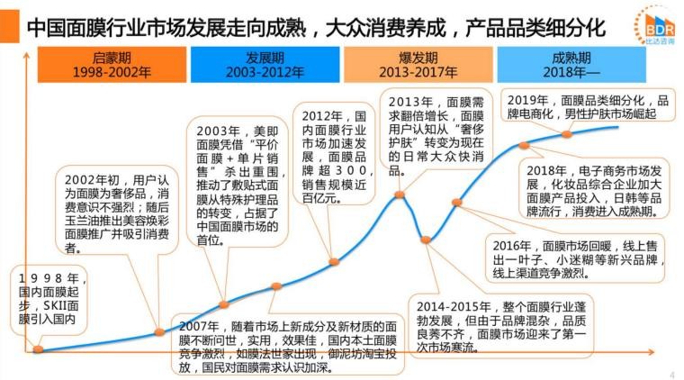 而根据“比达咨询”对中国面膜市场的整体研究,中国现代面膜产业的发展,已经完整经历了“启蒙期”“发展期”“爆发期”三个阶段,从2018年起,整个市场已经逐步进入了成熟期。