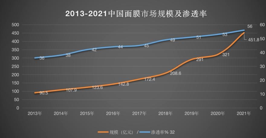 但是中国的面膜市场无论是渗透率还是市场规模,仍然在持续高速增长。据观研报告整理的数据显示,到2021年中国市场面膜渗透率已经达到了56%,整体渗透率和日韩等发达国家已经比较接近。面膜的整体市场规模也从2013年的90.5亿元增长到了2021年的451.8亿元。