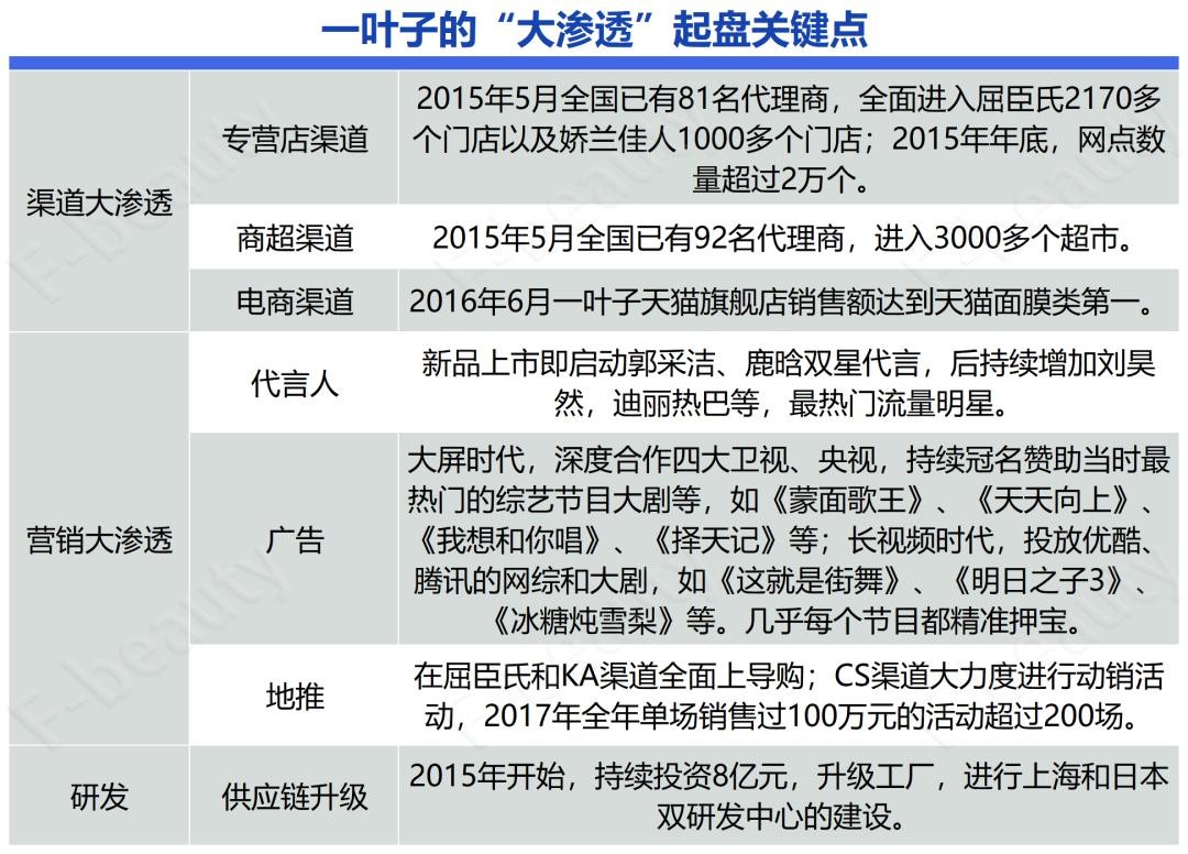 而在渠道大渗透和营销大渗透上,一叶子更是“大开大阖”,在很短的时间内,实现了线上线下全渠道的全面渗透。广告预算更是持续增加,当时的顶流明星和最热门综艺,几乎都和一叶子有合作。