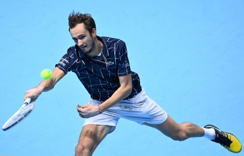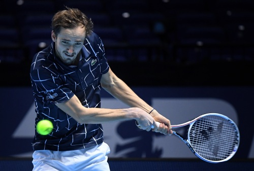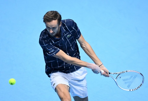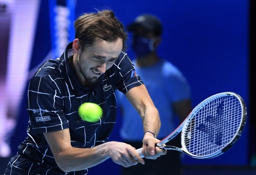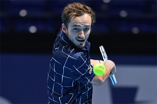 新华社照片,外代,2020年11月23日(外代二线)(35)网球——ATP年终总决赛:梅德韦杰夫夺冠11月22日,梅德韦杰夫在比赛中回球。当日,在英国伦敦进行的2020ATP世界巡回赛年终总决赛的比赛中,俄罗斯选手梅德韦杰夫以2比1战胜奥地利选手蒂姆,获得冠军。新华社/法新