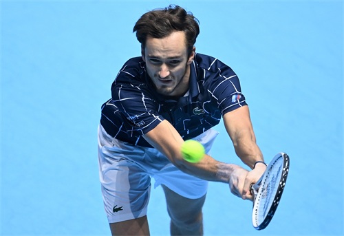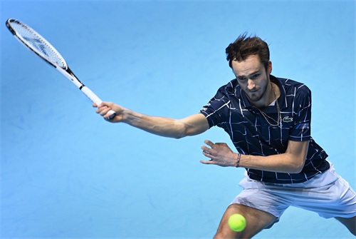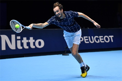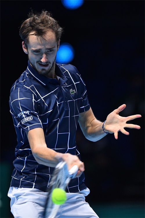 新华社照片,外代,2020年11月23日(外代二线)(4)网球——ATP年终总决赛:梅德韦杰夫夺冠11月22日,梅德韦杰夫在比赛中回球。当日,在英国伦敦进行的2020ATP世界巡回赛年终总决赛的比赛中,俄罗斯选手梅德韦杰夫以2比1战胜奥地利选手蒂姆,获得冠军。新华社/欧新