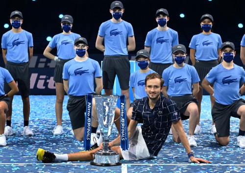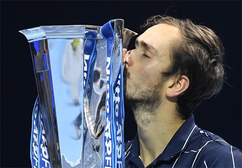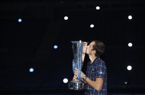 新华社照片,外代,2020年11月23日(外代二线)(48)网球——ATP年终总决赛:梅德韦杰夫夺冠11月22日,梅德韦杰夫与冠军奖杯合影。当日,在英国伦敦进行的2020ATP世界巡回赛年终总决赛的比赛中,俄罗斯选手梅德韦杰夫以2比1战胜奥地利选手蒂姆,获得冠军。新华社/路透