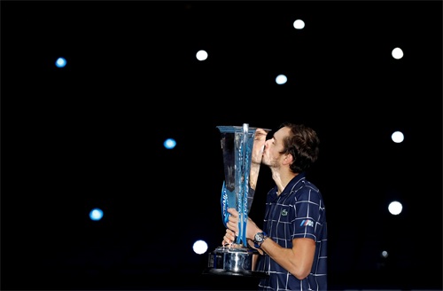 新华社照片,外代,2020年11月23日(外代二线)(53)网球——ATP年终总决赛:梅德韦杰夫夺冠11月22日,梅德韦杰夫手举冠军奖杯庆祝。当日,在英国伦敦进行的2020ATP世界巡回赛年终总决赛的比赛中,俄罗斯选手梅德韦杰夫以2比1战胜奥地利选手蒂姆,获得冠军。新华社/路透