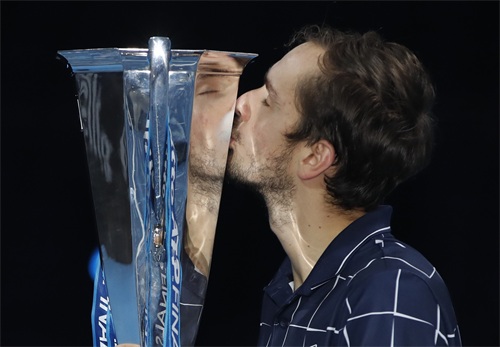 新华社照片,外代,2020年11月23日(外代二线)(46)网球——ATP年终总决赛:梅德韦杰夫夺冠11月22日,梅德韦杰夫亲吻冠军奖杯。当日,在英国伦敦进行的2020ATP世界巡回赛年终总决赛的比赛中,俄罗斯选手梅德韦杰夫以2比1战胜奥地利选手蒂姆,获得冠军。新华社/路透