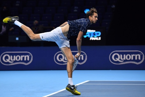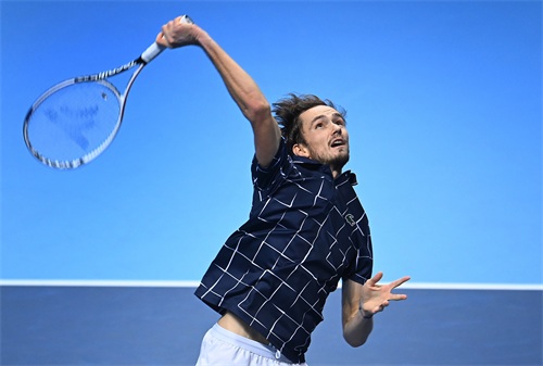 新华社照片,外代,2020年11月23日(外代二线)(32)网球——ATP年终总决赛:梅德韦杰夫夺冠11月22日,梅德韦杰夫在比赛中发球。当日,在英国伦敦进行的2020ATP世界巡回赛年终总决赛的比赛中,俄罗斯选手梅德韦杰夫以2比1战胜奥地利选手蒂姆,获得冠军。新华社/法新