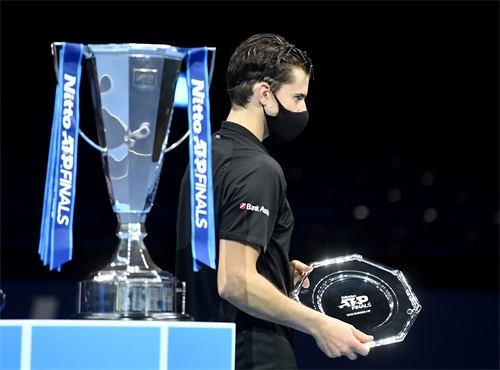 新华社照片,外代,2020年11月23日(外代二线)(58)网球——ATP年终总决赛:梅德韦杰夫夺冠11月22日,蒂姆手持亚军奖杯。当日,在英国伦敦进行的2020ATP世界巡回赛年终总决赛的比赛中,俄罗斯选手梅德韦杰夫以2比1战胜奥地利选手蒂姆,获得冠军。新华社/路透