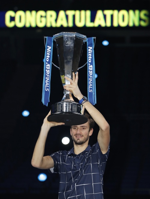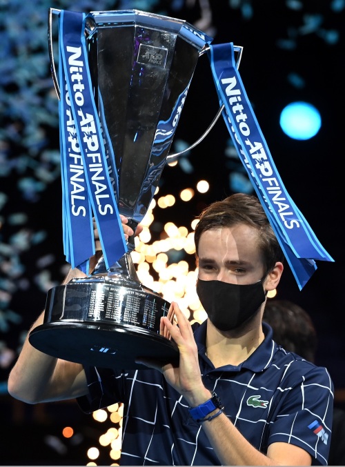 新华社照片,外代,2020年11月23日(外代二线)(45)网球——ATP年终总决赛:梅德韦杰夫夺冠11月22日,梅德韦杰夫与冠军奖杯合影。当日,在英国伦敦进行的2020ATP世界巡回赛年终总决赛的比赛中,俄罗斯选手梅德韦杰夫以2比1战胜奥地利选手蒂姆,获得冠军。新华社/路透