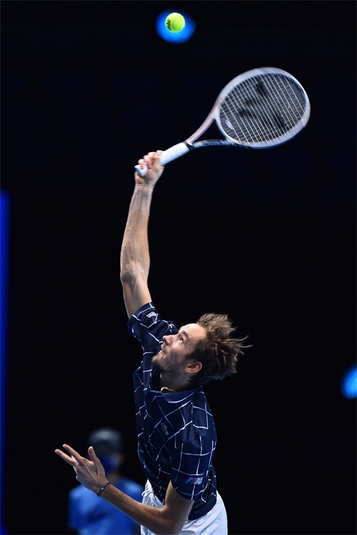 新华社照片,外代,2020年11月23日(外代二线)(10)网球——ATP年终总决赛:梅德韦杰夫夺冠11月22日,梅德韦杰夫在比赛中发球。当日,在英国伦敦进行的2020ATP世界巡回赛年终总决赛的比赛中,俄罗斯选手梅德韦杰夫以2比1战胜奥地利选手蒂姆,获得冠军。新华社/欧新