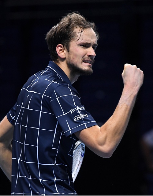 新华社照片,外代,2020年11月23日(外代二线)(17)网球——ATP年终总决赛:梅德韦杰夫夺冠11月22日,梅德韦杰夫在比赛中握拳。当日,在英国伦敦进行的2020ATP世界巡回赛年终总决赛的比赛中,俄罗斯选手梅德韦杰夫以2比1战胜奥地利选手蒂姆,获得冠军。新华社/欧新