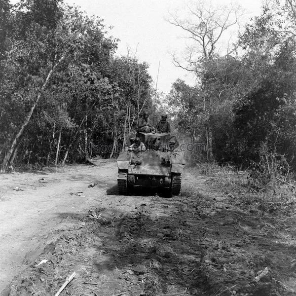 顿时我们的坦克上炮火齐鸣(我营原是M3A3轻型坦克,现已换成装有口径为七十五厘米的M4A4中型坦克),各排以楔队形交互前进,狂轰猛打,敌坦克被我们打得动颤不得,我乘胜攻入市内。日军见其坦克全被击毁,毫无还手之力,失去最后一线希望,纷纷掉头泅水向南坎方向逃窜。我与步兵一起追打逃敌,河岸旁躺满了日军尸体,经过一个多月的激战,于十二月十五日完全攻战八莫。