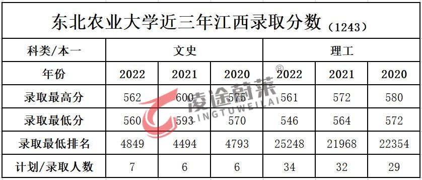 2022年东北农大共录取了6219名本科新生,其中,在江西计划录取41人。下图为东北农大近三年在江西的录取数据: