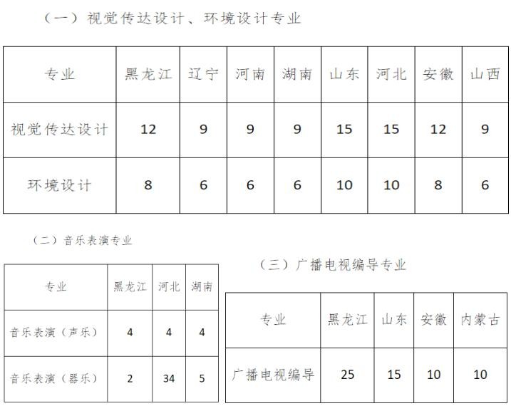 注:视觉传达设计专业按平面设计、广告设计、动画设计三个方向培养;环境设计专业按室内设计、景观设计两个方向培养;声乐:只招收美声唱法、民族唱法考生。