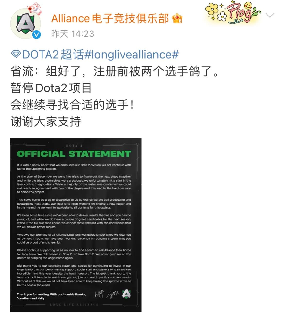另外,Alliance战队联合创始人kellyMILKIES也就此事发文说道: