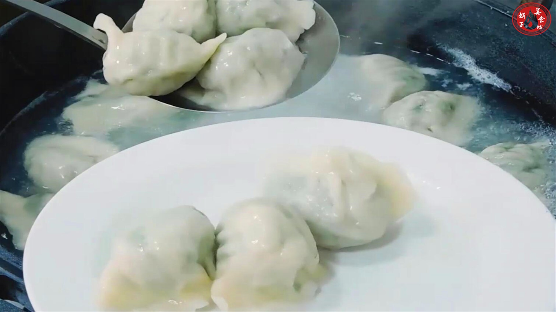 9;煮沸后点入凉水再推几次继续煮沸,待饺子肚向上并鼓起,关火,捞起饺子盛入盘中就可以开动了