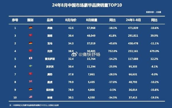 【CNMO 科技消息】近日,CNMO 注意到,有汽车博主发布了一份 8 月份中国市场豪华品牌销量 TOP10 榜单,揭示了当前豪华车市场的竞争格局。