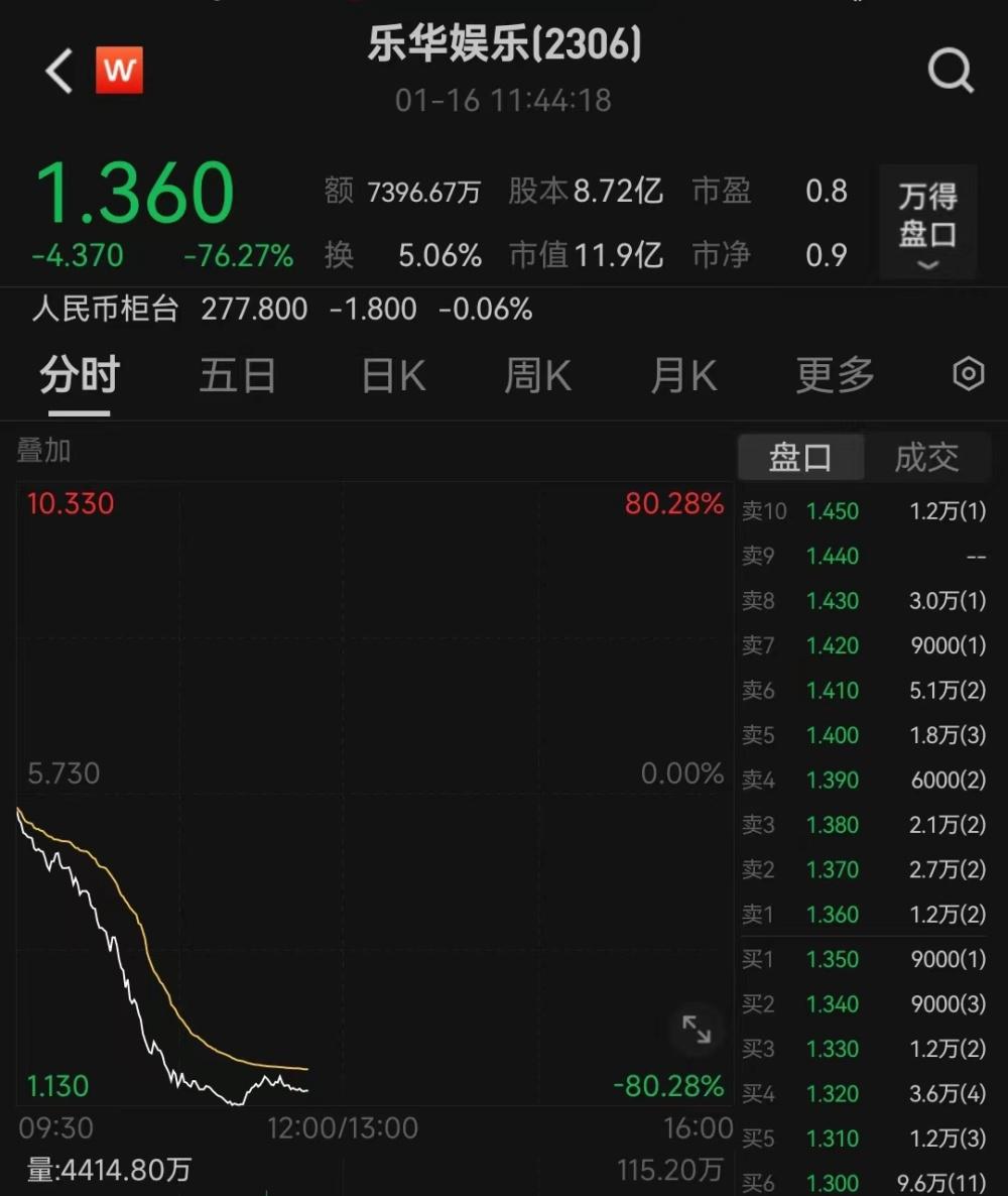 金融界 1 月 16 日消息 " 艺人经纪第一股 " 港股乐华娱乐今日持续走低,目前大跌近 80%,盘中一度跌超 80%。