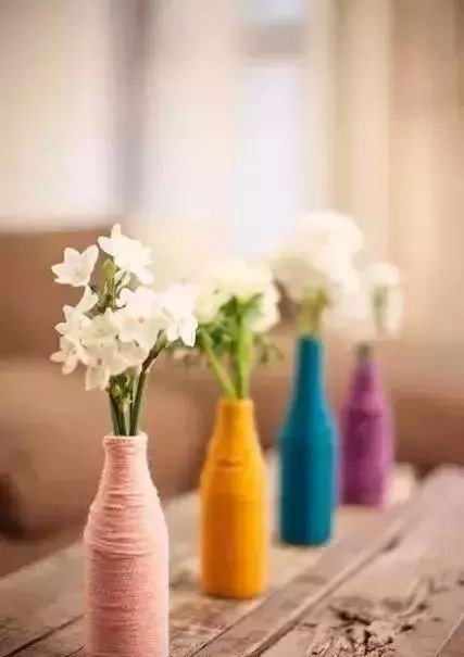 先将花瓶涂满乳胶,趁没干将毛线由下至上一圈一圈缠绕瓶子,放置在一旁等待干,就可以得到一个个多彩的文艺花瓶了。
