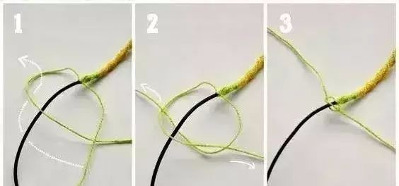 2:将较短毛线绕住叉子上的毛线,然后打个结。