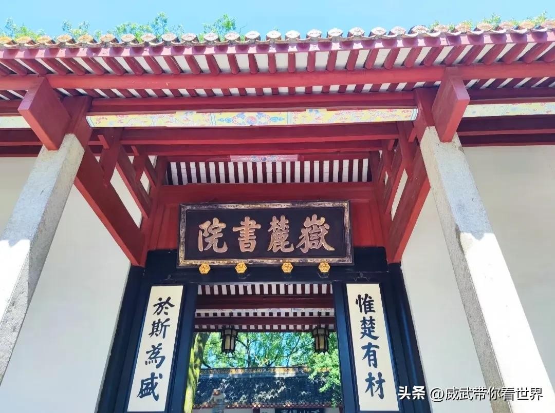 可以先从岳麓书院开始游览,岳麓山书院前门门进入就是赫曦台,这里是宋朝朱熹和张栻会讲的地方,左右两边有“福”“寿”两个大字,顶部雕刻有蝙蝠、八卦图、寿字图案。往前走才是真正的大门,门口有宋真宗亲赐的“岳麓书院”牌匾,两边柱子悬挂有一副对联:“惟楚有材,于斯为盛”,意为岳麓书院教育有方,人才辈出。