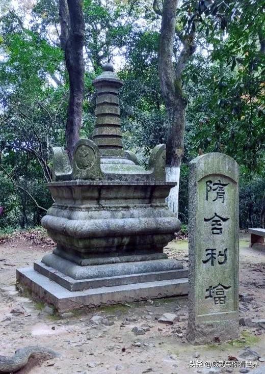 隋舍利塔位于爱晚亭左边,该塔以花岗岩石砌而成,外表看像僧帽。整座共塔分三层,底部是塔座,作须弥座式,中间四角像蕉叶状,浮雕力士像五尊,含有守护宝塔的意思,层顶端形状就像是僧帽宝顶。