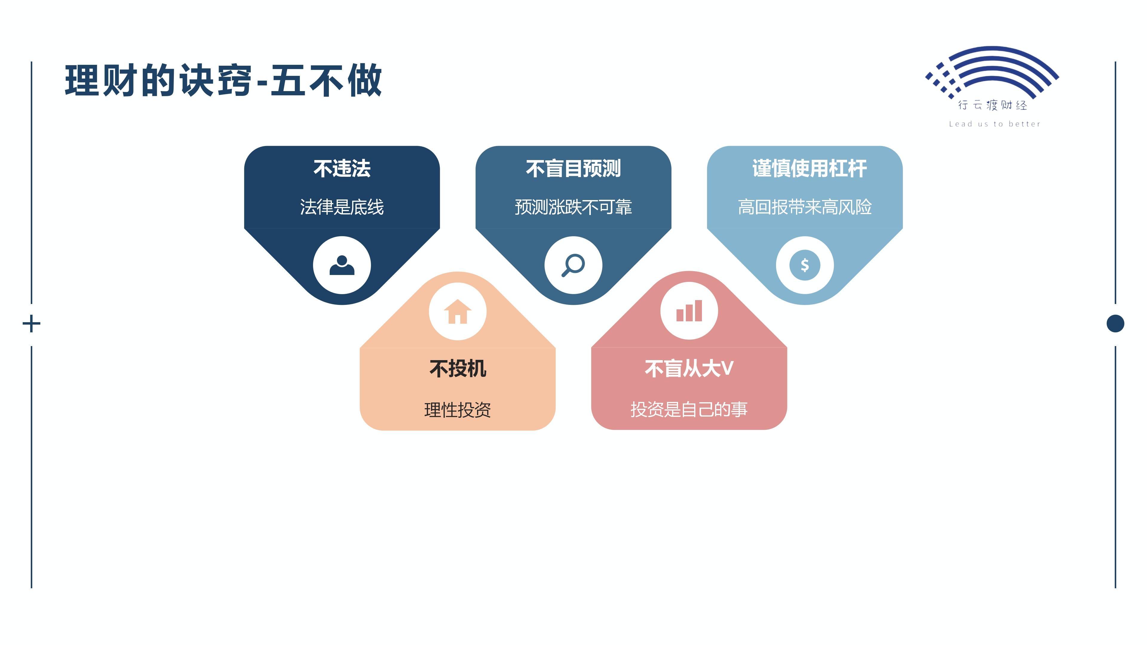 我从日常的实践中,给理财总结下来,就是五做五不做。掌握了这些,再面对纷繁的资本市场时,你就不会再慌张。