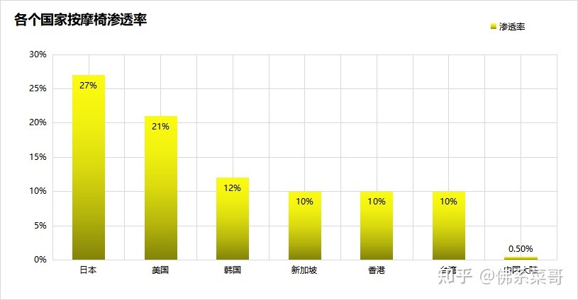 中国香港和中国台湾地区按摩椅渗透率都在10%左右,而中国大陆地区按摩椅市场渗透率不到1%,与其他地区有很大的差距,虽然我们国家是生产大国,但是在这一方面的消费还是远远落后的。