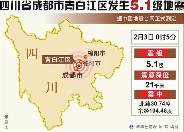 根据中国地震台网的正式测定:2月3日0时5分在四川成都市青白江区发生5.1级地震,震源深度21千米,震中位于北纬30.74度,东经104.46度。