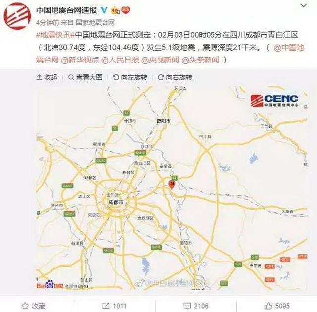 成都5.1级地震最新消息地震现场视频曝光!2月3日0时5分,四川成都市青白江区发生5.1级地震。