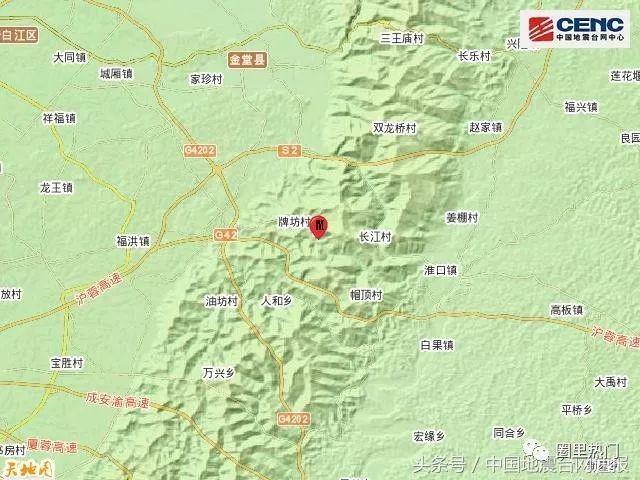随后,四川省地震局发布了一则来自机器人快速生成的地震信息。本次地震周边5公里内的村庄有张家湾、红星村、拱桥湾、人和乡三元村、闫家垭口、南岳村、红岩村,20公里内的乡镇有云顶乡、清泉镇、福洪镇、姚渡镇、三溪镇、城厢镇、福兴镇。