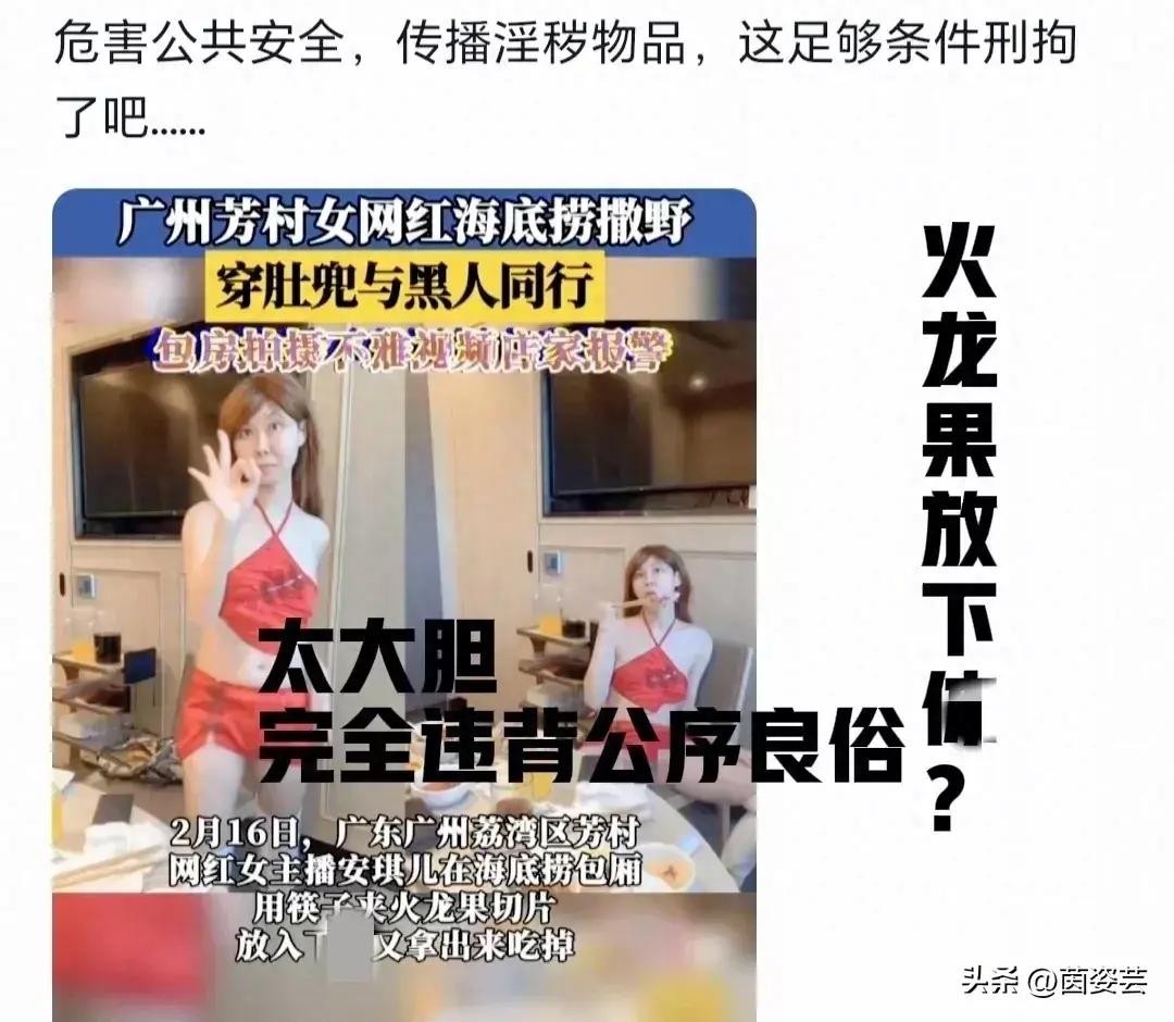 最近有报道称,一位名为安琪儿的网络主播,在2月16日于广州某海底捞用餐期间,进行了一项极不适宜的行为:她用筷子将火龙果片放置于不当位置,随后取出食用。这一行径严重违反了社会公德,令人震惊,难怪众多网友表示这一幕实在是令人难以直视。