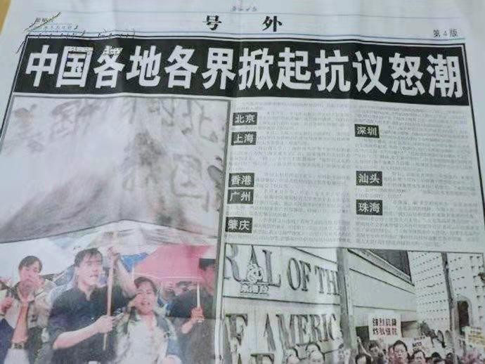 1999年5月8日凌晨5时45分,北约空袭部队的5枚导弹击中中国驻贝尔格莱德大使馆,中国记者邵云环和光明日报记者许杏虎及夫人朱颖遇难,20多人受伤。空袭激起了善良的中国人民的民族义愤,一时间举国同仇,我国各地的学生民众纷纷举行示威游行,抗议以美国为首的北约的野蛮行径。